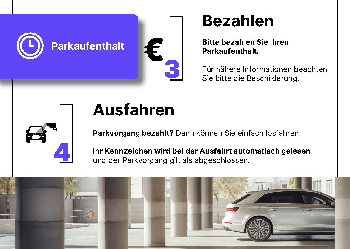 Bitte beachten Sie, dass wir ab dem 17. November 2025 auf ein ticket- und schrankenloses Parksystem umstellen. Merken Sie sich unbedingt Ihr Kennzeichen, wenn Sie Ihr Fahrzeug verlassen.